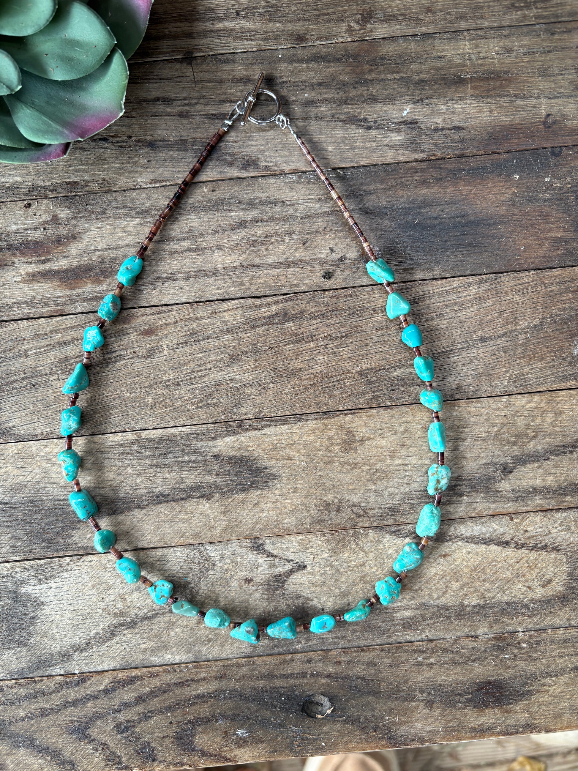 This vibrant 19-inch necklace features a stunning mix of turquoise and shell beads, each one unique in shape and color. The natural turquoise offers a bright pop of blue-green, paired with soft-toned shell beads for the perfect balance of earthy and coastal vibes. Every piece is one of a kind due to the nature of the stones used.