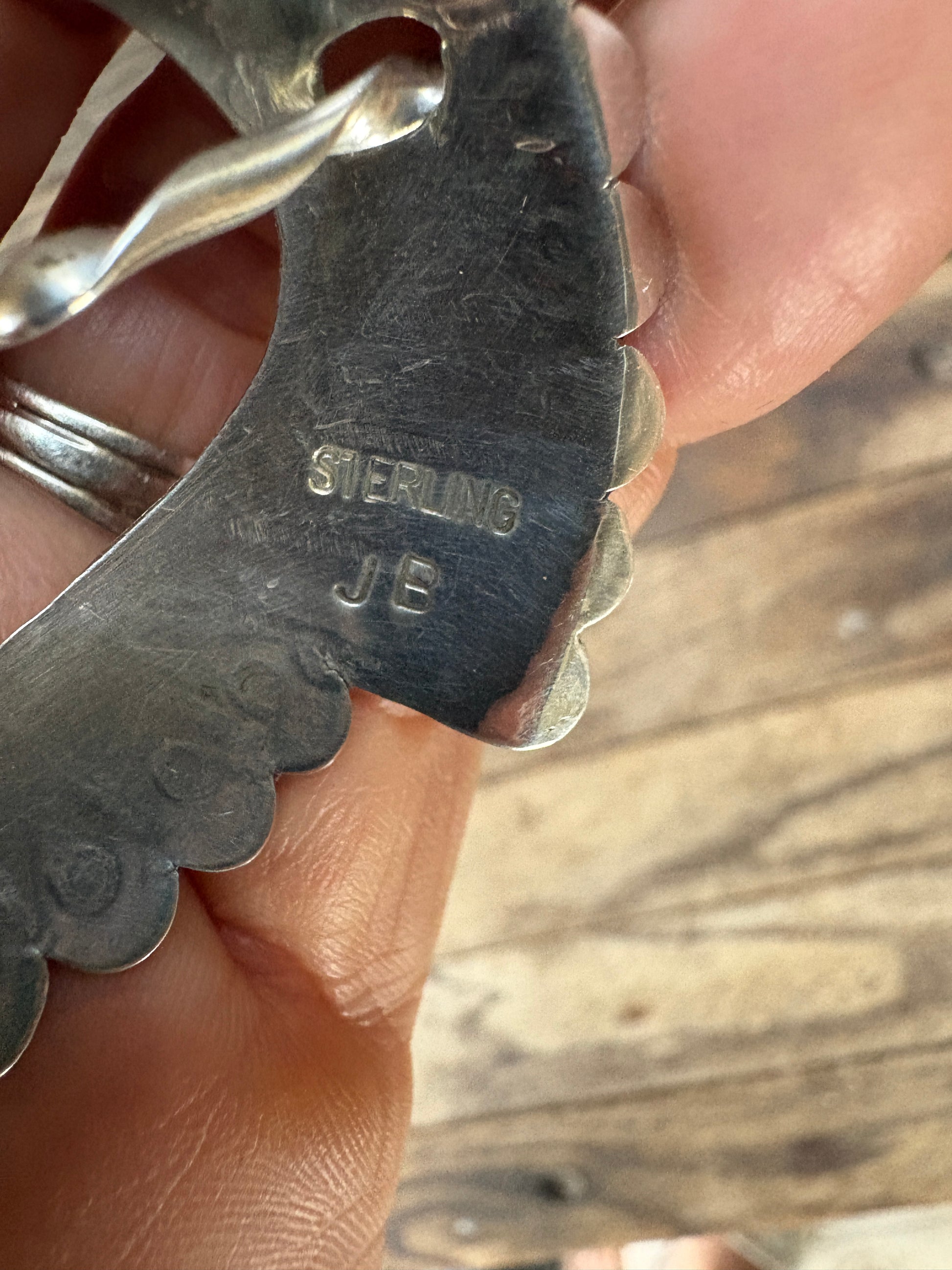 This beautiful turquoise and bright-polish sterling silver hair pin was made by Navajo silversmith Jolene Begay. The back is stamped JB and sterling.