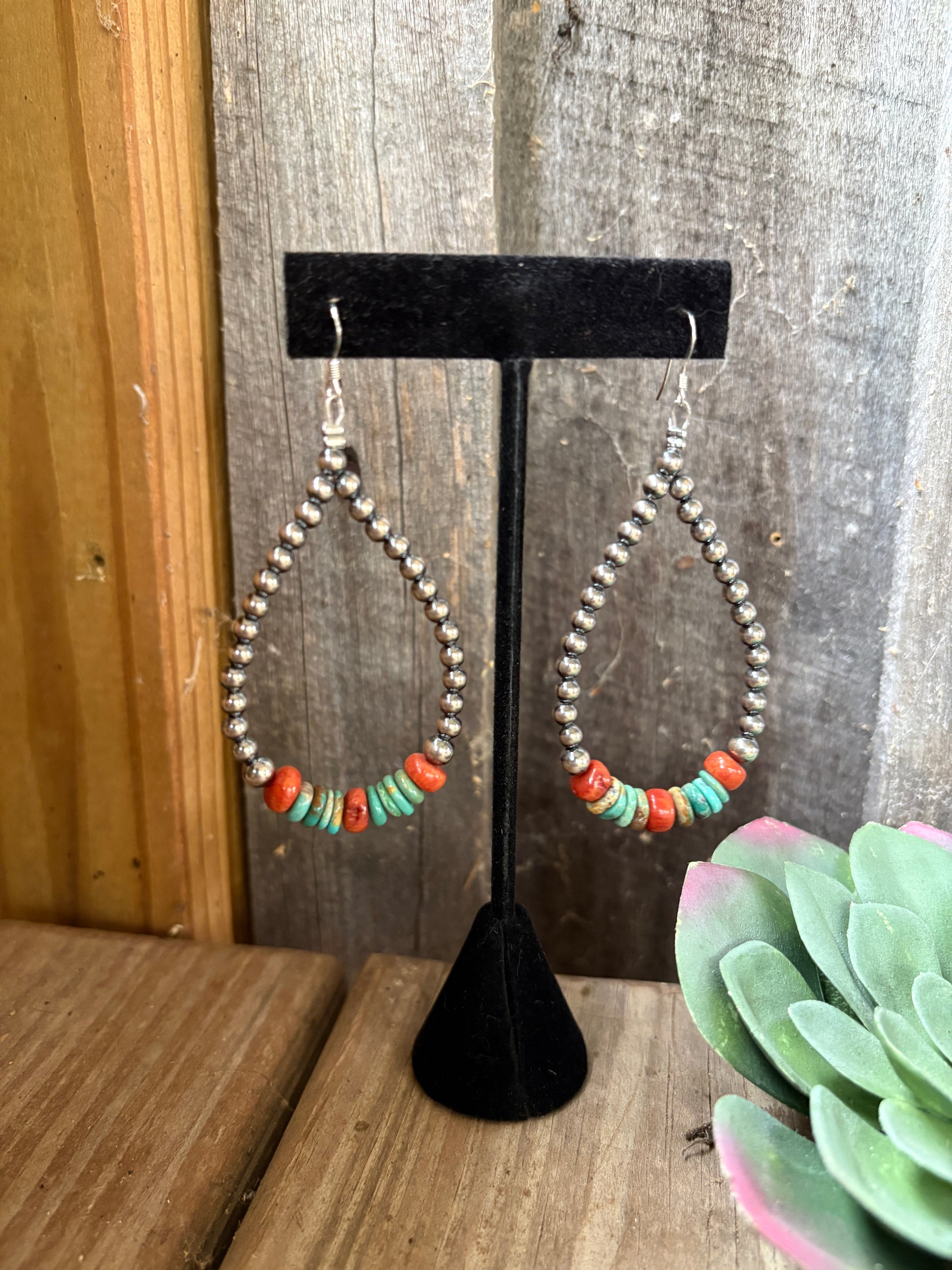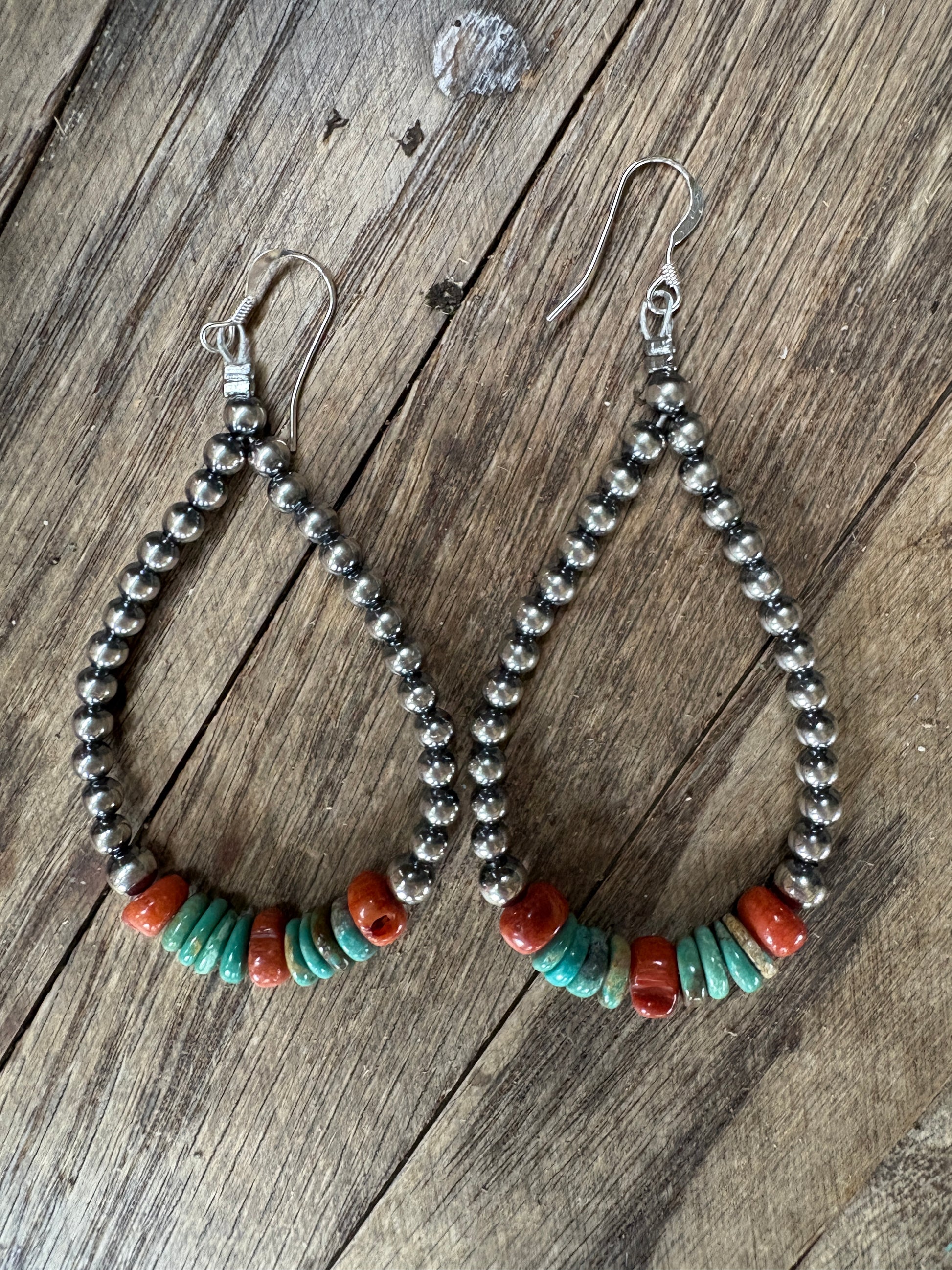 Sterling Silver Pearls earrings teardrop with turquoise and coral